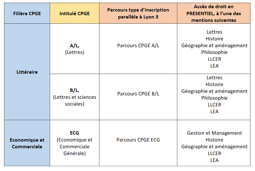 Les fili¨¨res CPGE propos¨¦es ¨¤ l¡¯universit¨¦ Lyon 3 et leurs correspondances