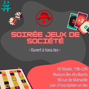 Rendez-vous pour une soirée jeux ! Une diversité de jeux est proposée (gestion, bluff, cartes, ...) tels que les Aventuriers du Rail, 7 Wonders Catan, Skyjo, Kosmopolit, Papayoo, Kluster, Résistance, Jama?ca, Mémoire 44, Root, etc.