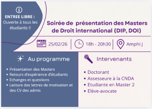 Présentation des masters de droit international public et droit des organisations internationales par des étudiants et anciens étudiants de ces masters et professionnel du droit ; partage des expériences scolaires (stages, concours de plaidoirie) et professionnelles (les débouchés après ces dipl?mes) ; présentation des lettres de motivation et CV des étudiants actuels de M1 à destination des étudiants de L3 pour mon.master.