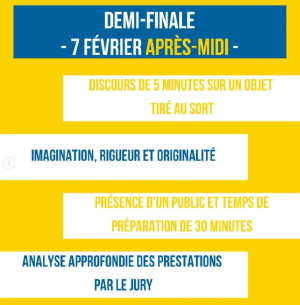 Venez assister à la demi-finale d'Imp(r)ose-Ton-?loquence ! 8 orateurs sélectionnés le matin même passeront devant un jury sur des sujets des plus spéciaux, dans l'espoir de se qualifier pour la grande finale improvisée du 26/02 à 18h. Pour cette épreuve, les sélectionnés n'auront que 30 minutes pour préparer leur discours, le soutien du public leur sera essentiel ! La demi-finale se tiendra au sein de l'Amphithé?tre Huvelin.