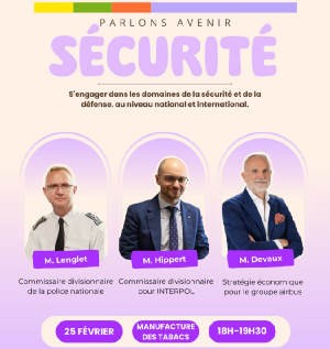 Avec Monsieur LENGLET, Commissaire divisionnaire de la police nationale ; Monsieur HIPPERT, Commissaire divisionnaire pour INTERPOL ; et Monsieur DEVAUX, Stratège économique pour le groupe Airbus.